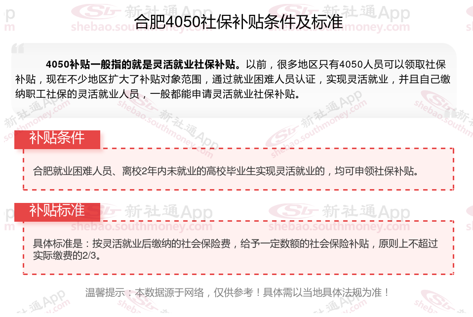 2024合肥灵活就业4050社保补贴是一项面向特定年龄段的就业困难人群的社会保险补贴。
