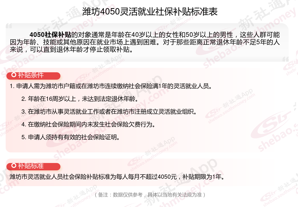 二、潍坊4050社保补贴标准及条件2023-2024年,最新如下