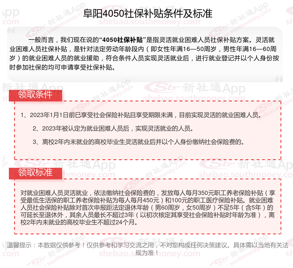 二、阜阳4050社保补贴标准及条件2023-2024年,最新如下