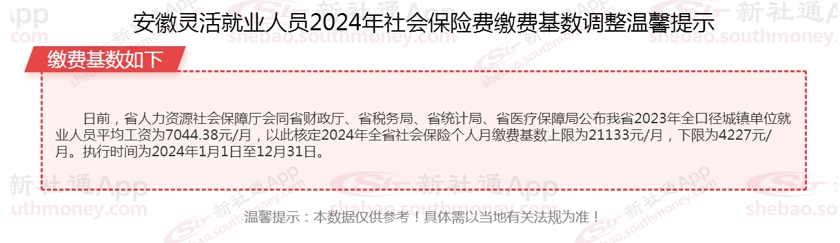 2024年安徽省灵活就业社保缴费基数上下限分别为4227元/月和21133元/月。这一标准适用于职工基本养老、医疗(生育)、失业和工伤保险,执行时间为2024年1月1日至2024年12月31日。