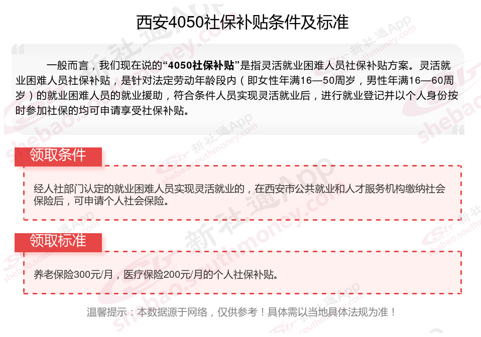 “4050人员”是国对大龄就业困难人员的一种称呼,指的是女性年满40岁,男性年满50岁的人员,那么西安4050灵活就业社保补贴标准是多少钱?西安4050社保补贴条件是什么?接下来随新社通APP小编了解一下最新资讯。