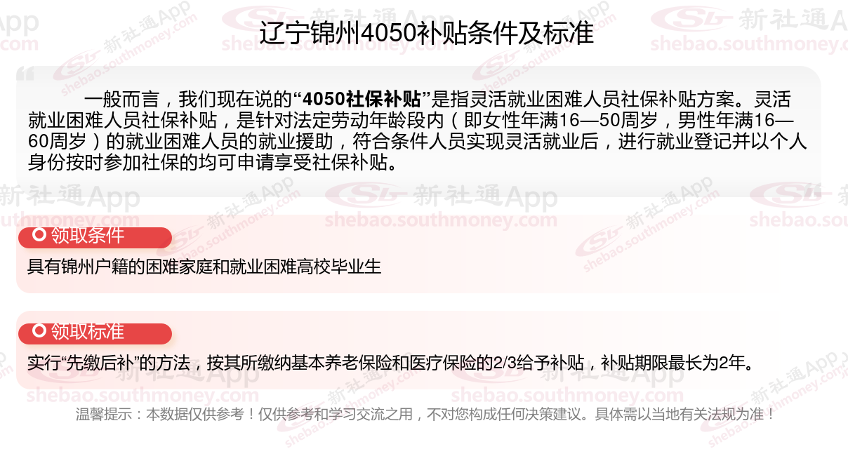 2025辽宁锦州4050补贴主要针对的是年龄在40岁以上的女性和50岁以上的男性,这些人群通常因为年龄较大而面临就业困难。