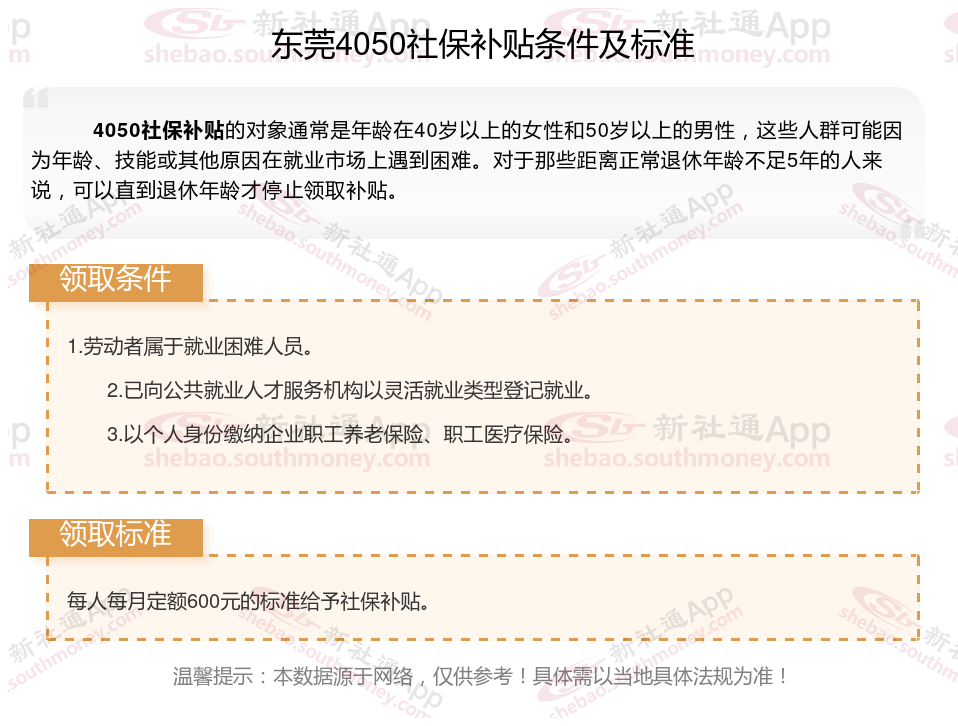 二、东莞4050社保补贴标准及条件2023-2024年,最新如下