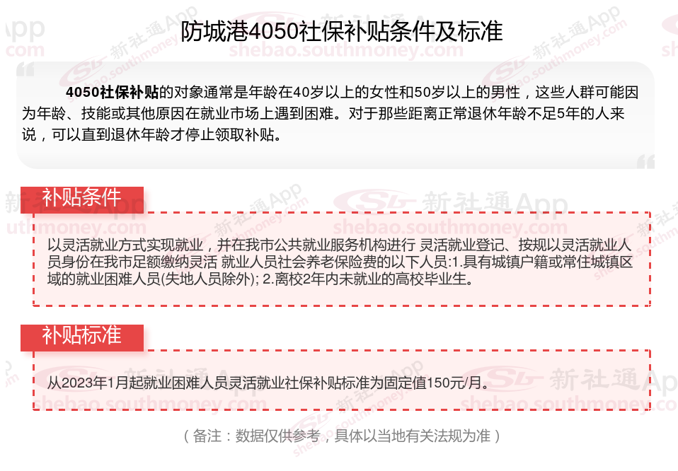 一、2023-2024年防城港4050社保补贴标准及条件,最新如下