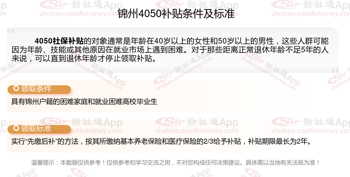 2025锦州4050补贴主要针对的是年龄在40岁以上的女性和50岁以上的男性,这些人群通常因为年龄较大而面临就业困难。