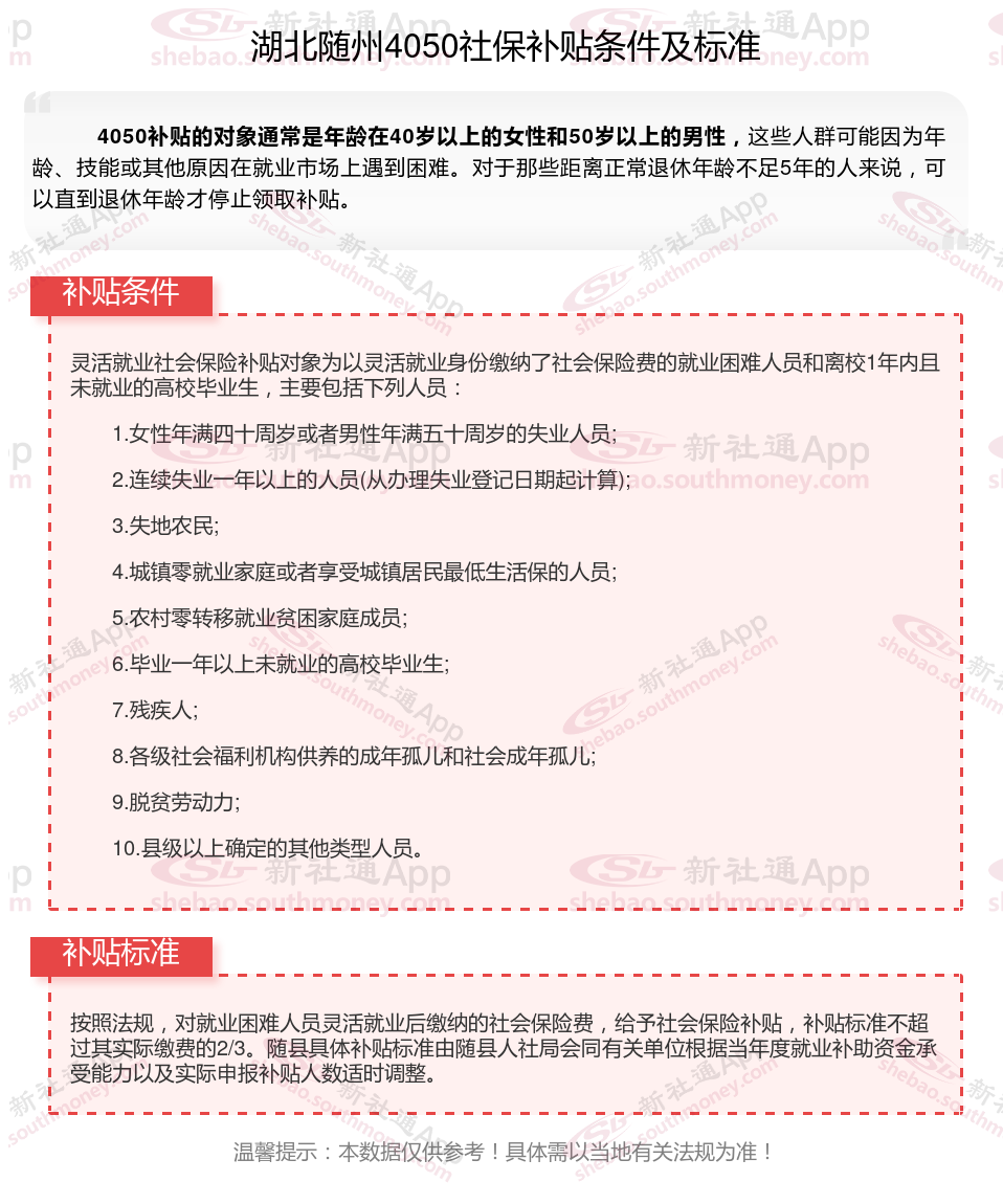 2025湖北随州灵活就业4050社保补贴是一项面向特定年龄段的就业困难人群的社会保险补贴。