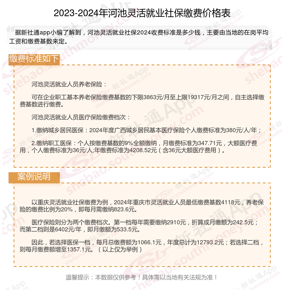 据新社通app数据显示,河池灵活就业人员养老保险缴费基数2024-2025年最新标准如下: