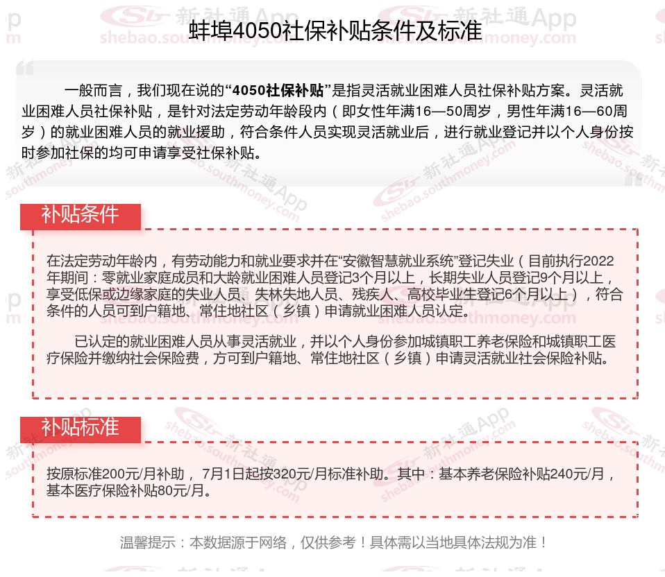 2025蚌埠4050补贴主要针对的是年龄在40岁以上的女性和50岁以上的男性,这些人群通常因为年龄较大而面临就业困难。