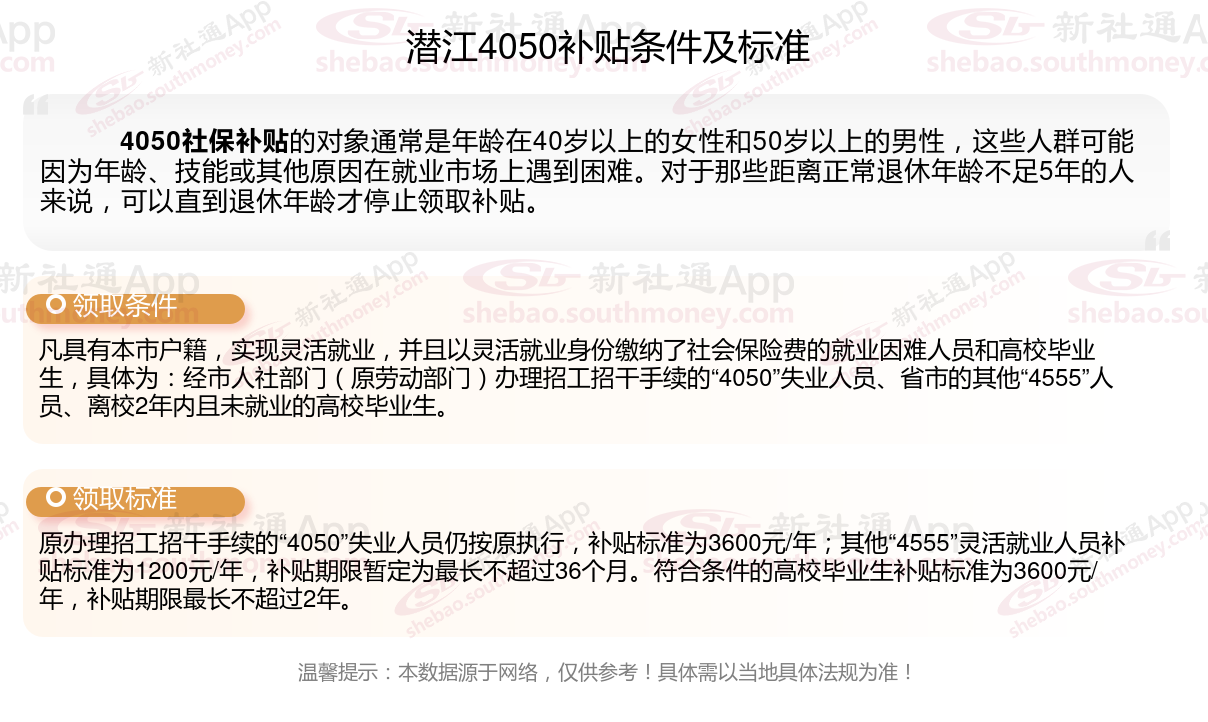 2025潜江4050补贴主要针对的是年龄在40岁以上的女性和50岁以上的男性,这些人群通常因为年龄较大而面临就业困难。