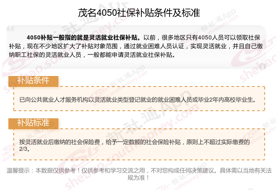 “4050人员”是国对大龄就业困难人员的一种称呼,指的是女性年满40岁,男性年满50岁的人员,那么茂名4050灵活就业社保补贴标准是多少钱?茂名4050社保补贴条件是什么?接下来随新社通APP小编了解一下最新资讯。
