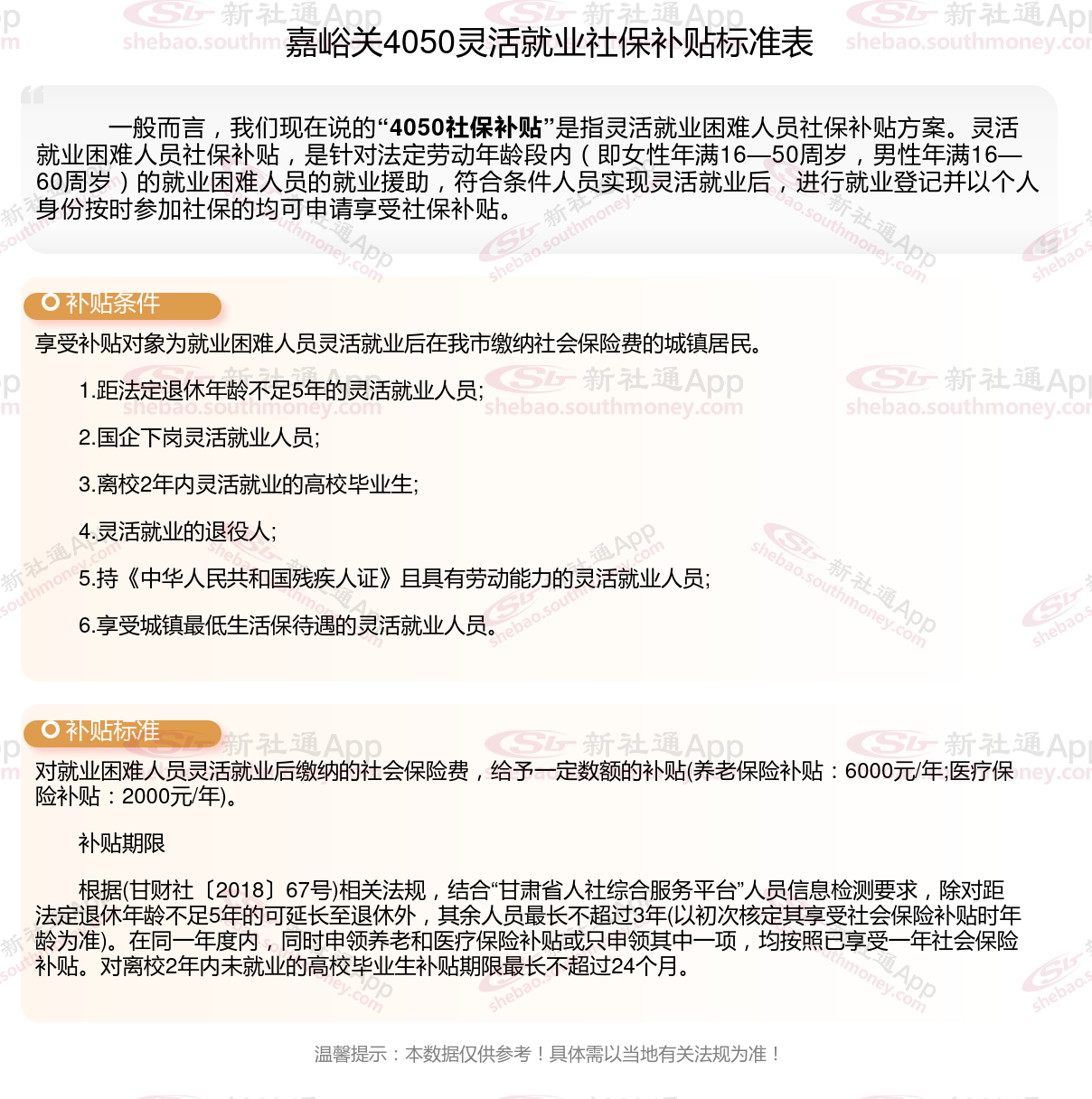 一、嘉峪关4050社保补贴标准及条件2023-2024年