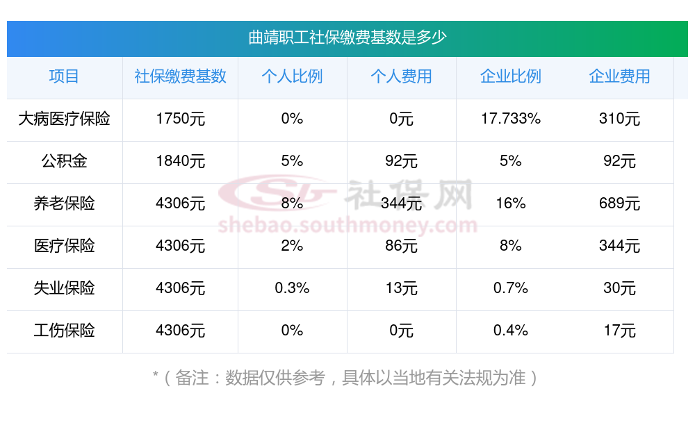 曲靖社保缴纳明细如下: