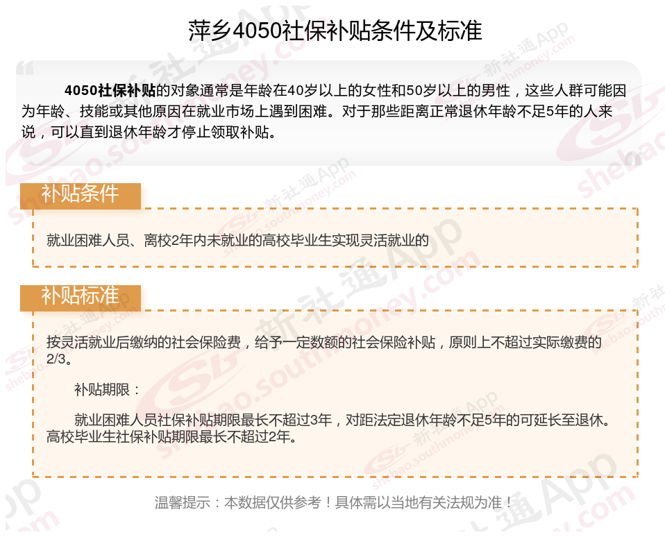 二、萍乡4050社保补贴标准及条件,最新如下:
