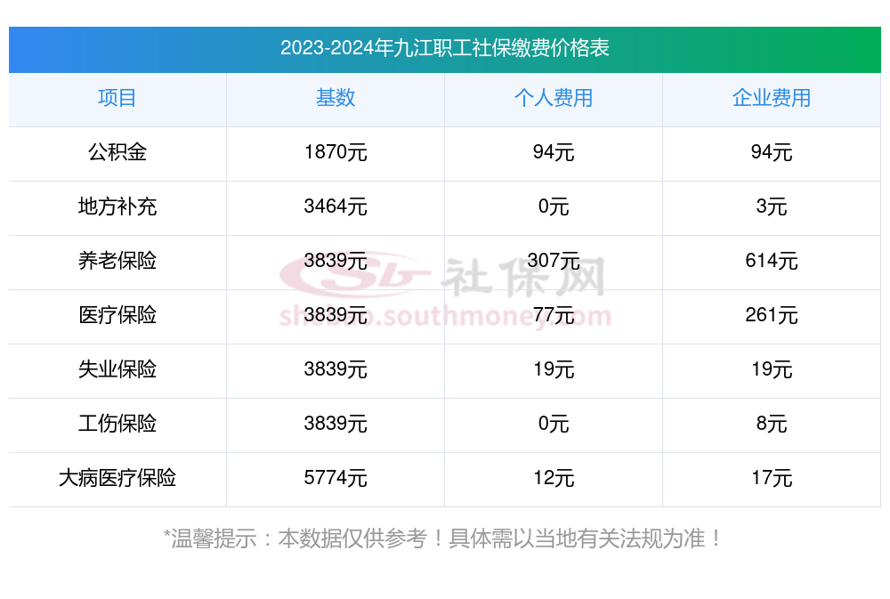 2025年九江社保缴费多少钱?下表是2023-2024年九江社保费用明细参考,新社通app-社保缴费查询工具提供的最新数据如下: