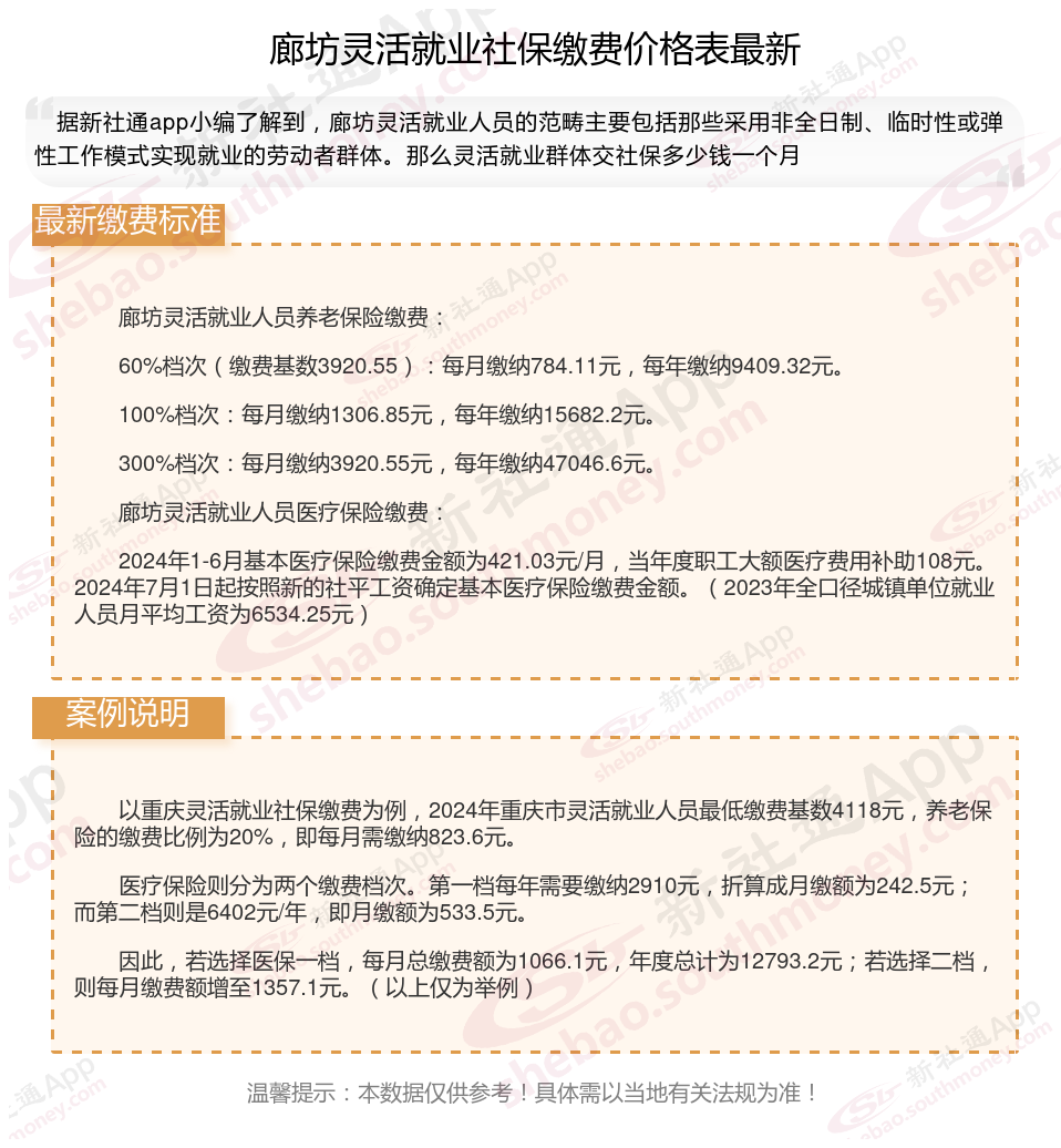 廊坊灵活就业人员基本养老保险缴费基数暂按不低于3920.55元;