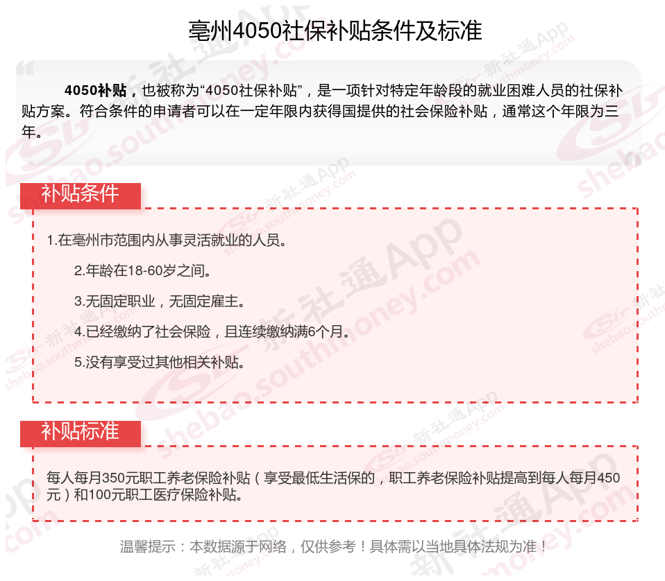 一、亳州灵活就业4050社保补贴标准及条件是什么