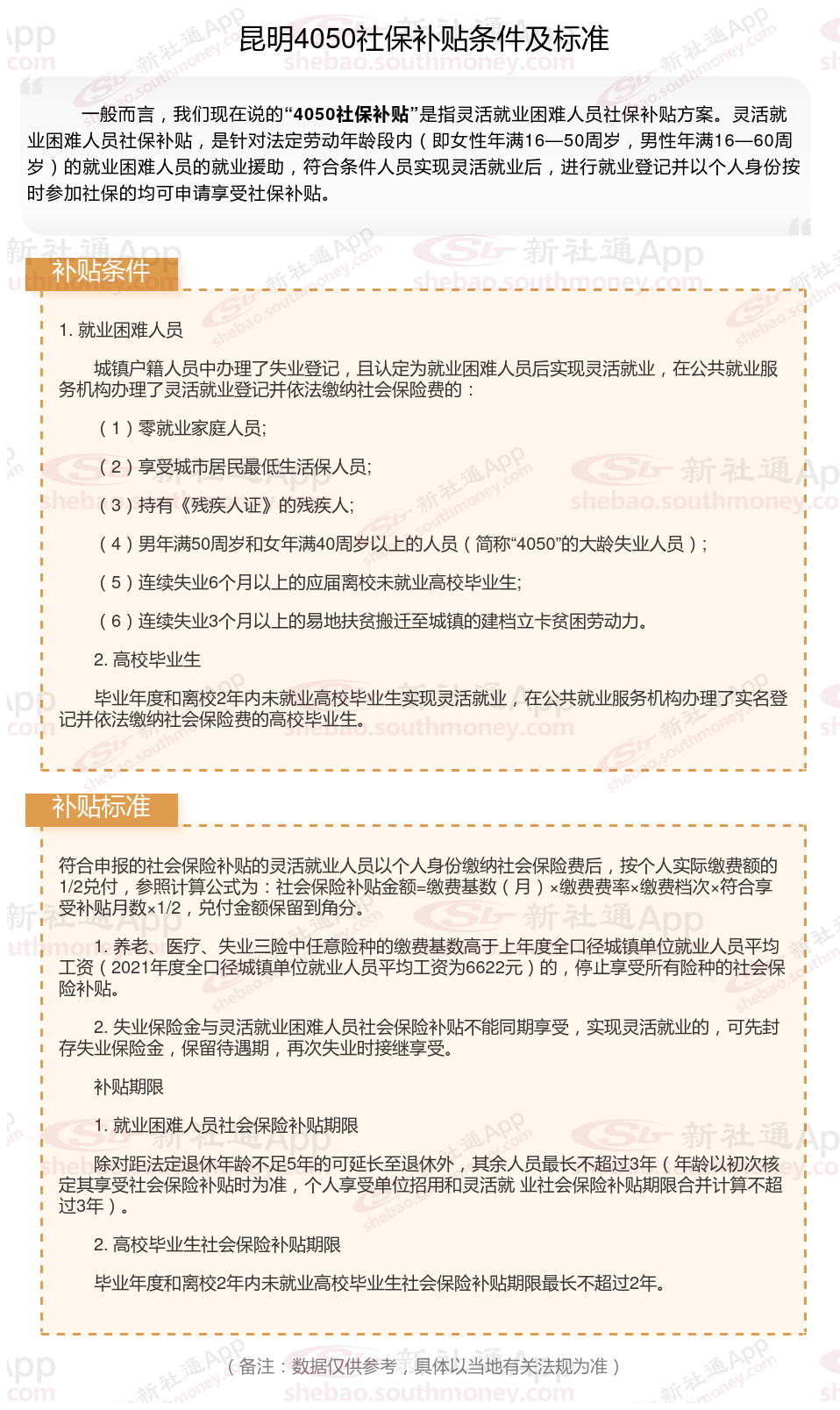 多数地区只有4050人员可以领取社保补贴,现在扩大了补贴对象及范围,通过就业困难人员认证,实现灵活就业,并且自己缴纳职工社保的灵活就业人员,一般都能申请灵活就业社保补贴。那么昆明4050灵活就业社保补贴标准是多少钱?昆明4050社保补贴条件是什么?接下来随新社通APP小编了解一下最新资讯。