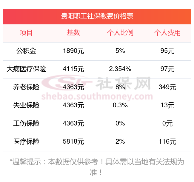 贵州贵阳缴费社保比例一览 社保公司和个人各交多少?下表是2024-2025年贵州贵阳社保费用明细参考,新社通app-社保缴费查询工具提供的最新数据如下: