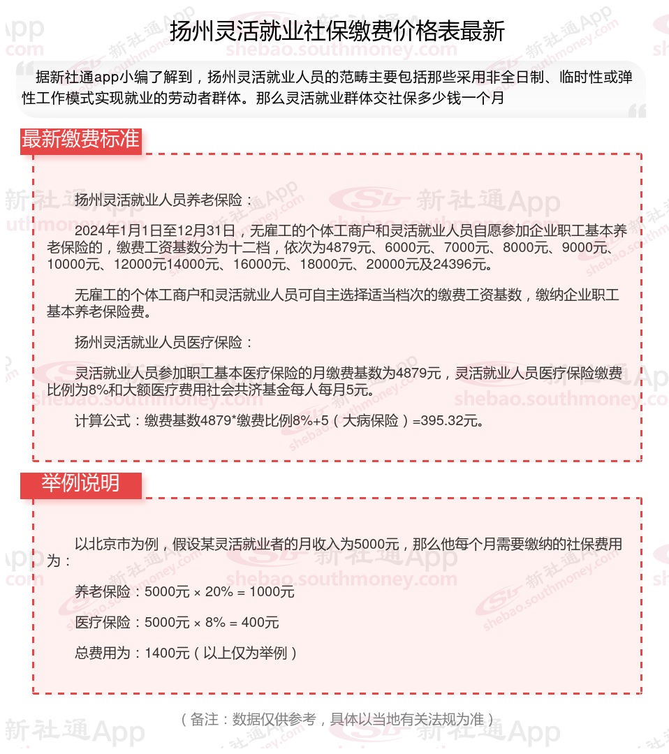 据新社通app数据显示,扬州灵活就业养老保险的缴费基数为:4494元。灵活就业人员参保缴费的比例为个人20%。