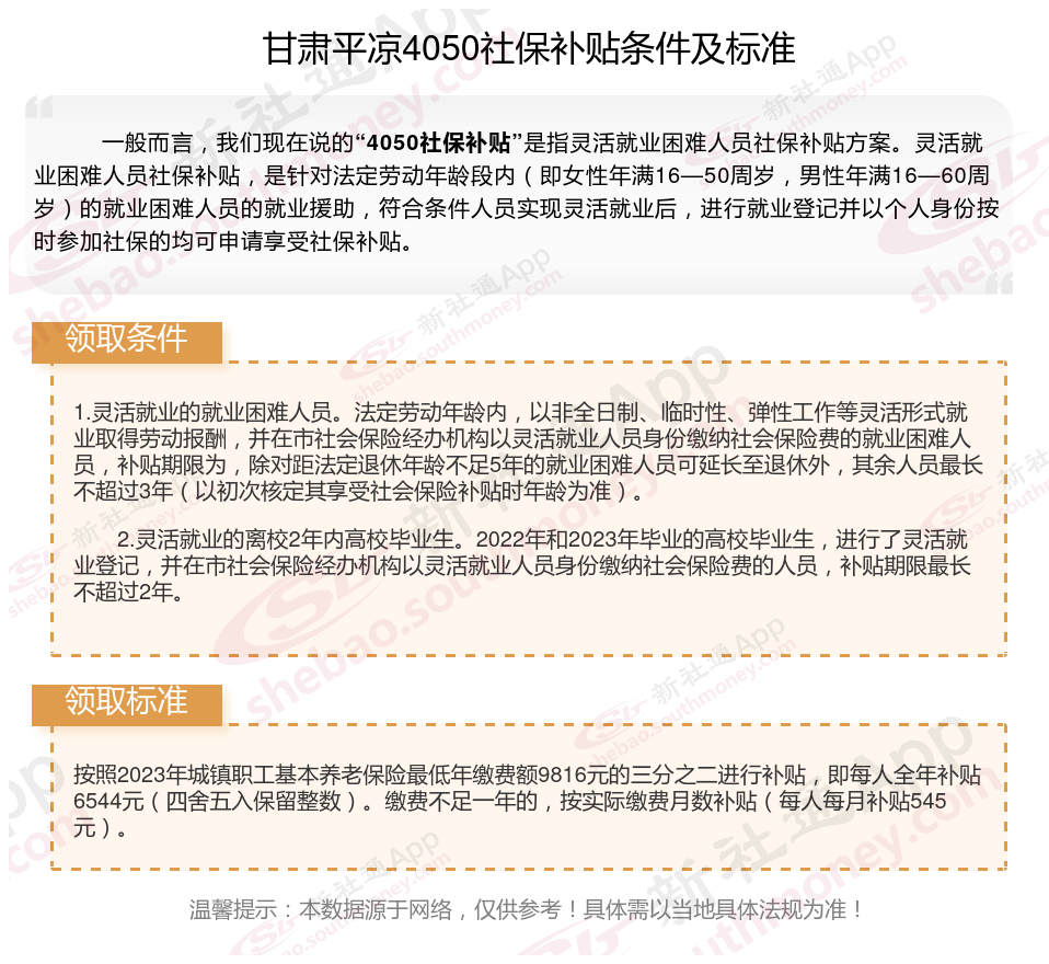 一、甘肃平凉4050社保补贴标准及条件2023-2024年