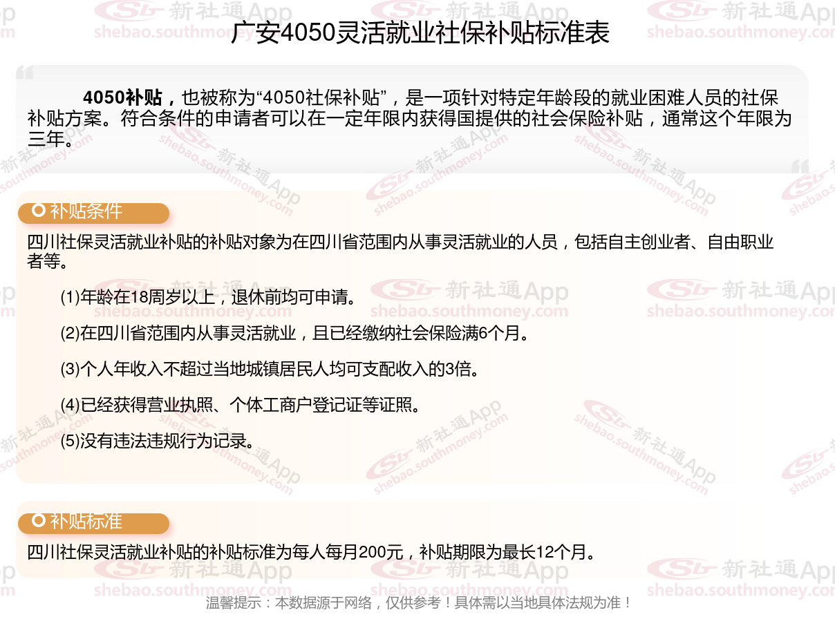 二、广安灵活就业4050社保补贴标准及条件是什么