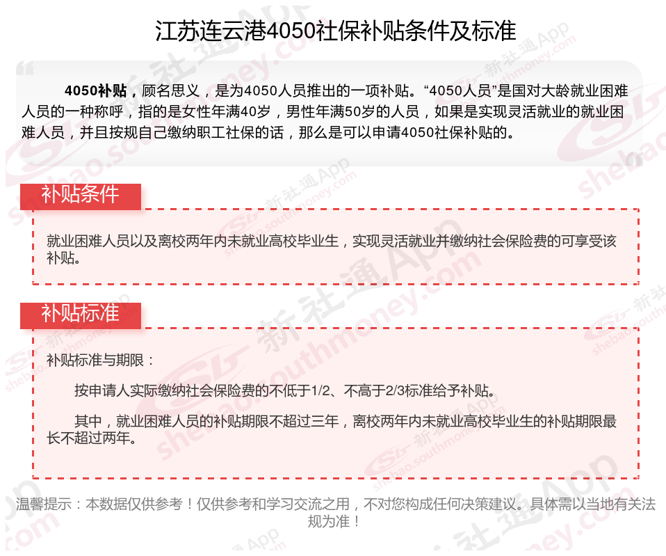 二、江苏连云港4050社保补贴标准及条件2023-2024年,最新如下