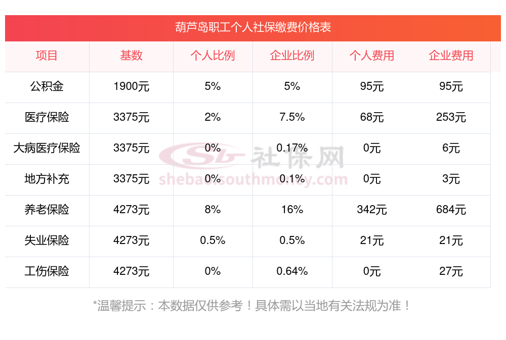 2025年葫芦岛社保缴费多少钱?下表是2024-2025年葫芦岛社保费用明细参考,新社通app-社保缴费查询工具提供的最新数据如下: