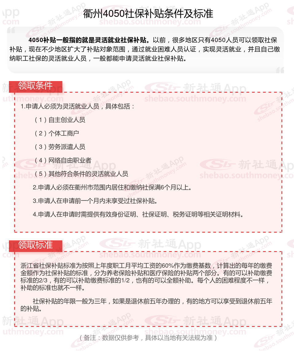 二、衢州灵活就业4050社保补贴标准及条件是什么