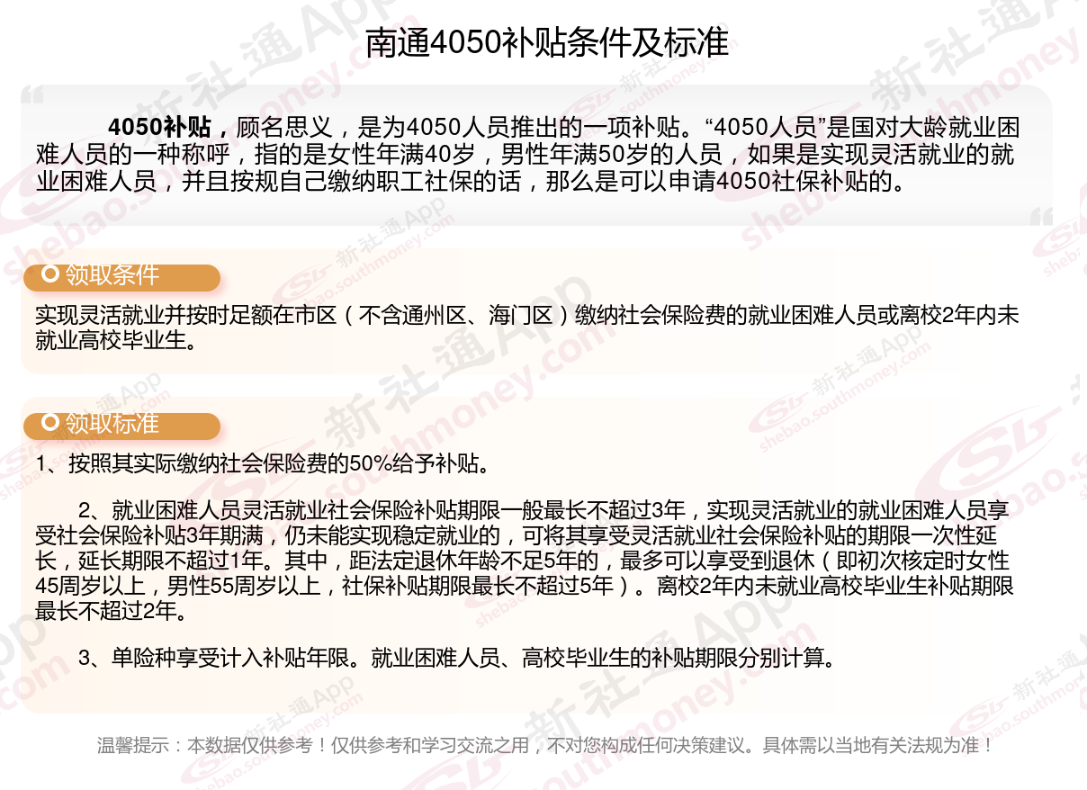 2025南通灵活就业4050社保补贴是一项面向特定年龄段的就业困难人群的社会保险补贴。