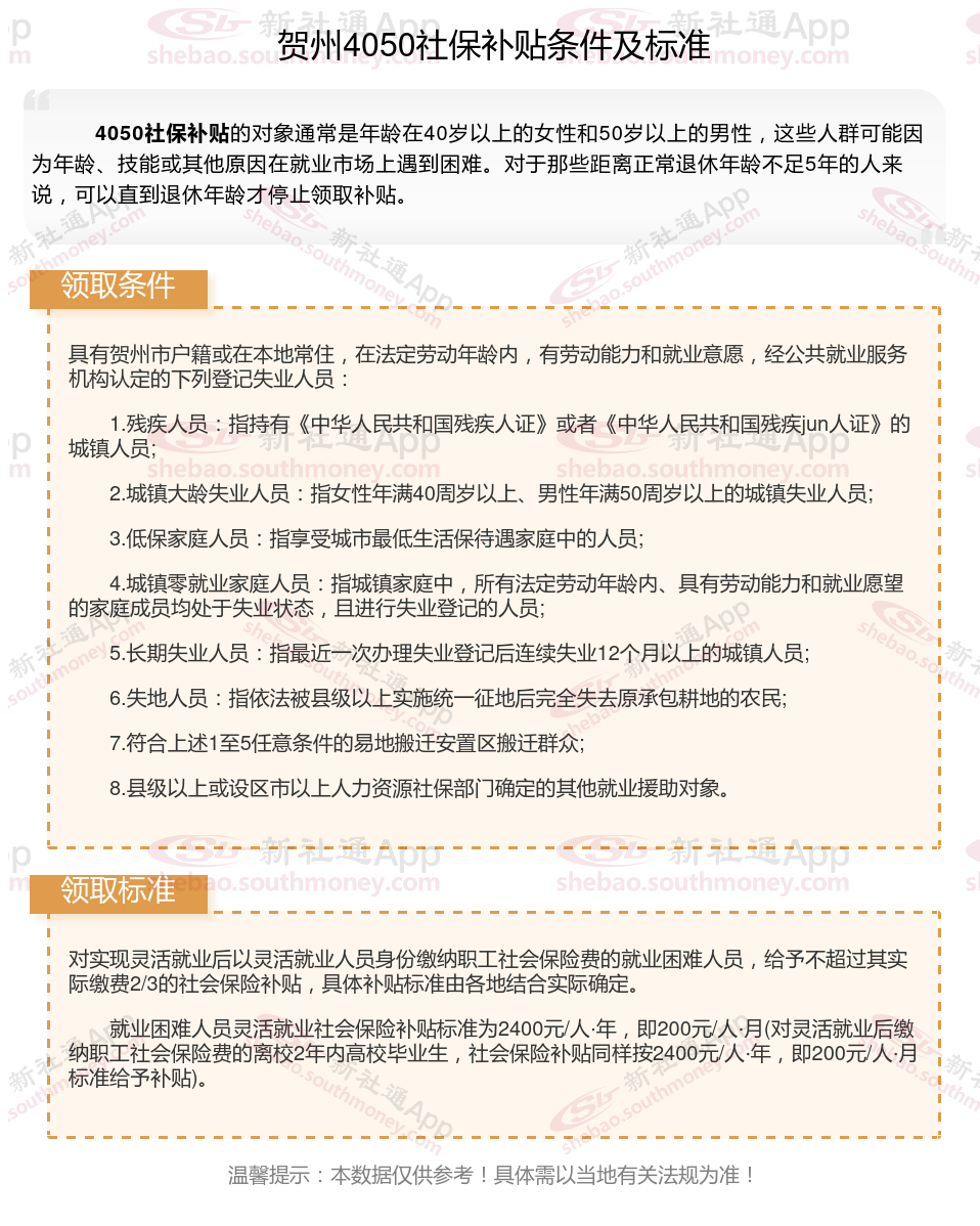 今天聊一下4050补贴的相关内容。4050补贴听起来像是一个针对特定年龄人群的社保补贴。比如女性需年满40周岁,男性需年满50周岁(以申请当年12月31日为截止日期)。那么贺州4050灵活就业困难人员社保补贴多少钱?贺州4050社保补贴可以申请吗?接下来随新社通APP小编具体了解一下4050社保补贴内容。