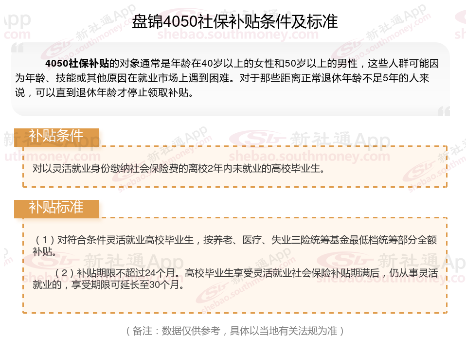 一、2025年盘锦灵活就业4050社保补贴标准及条件是什么(灵活就业4050社保补贴多少钱)