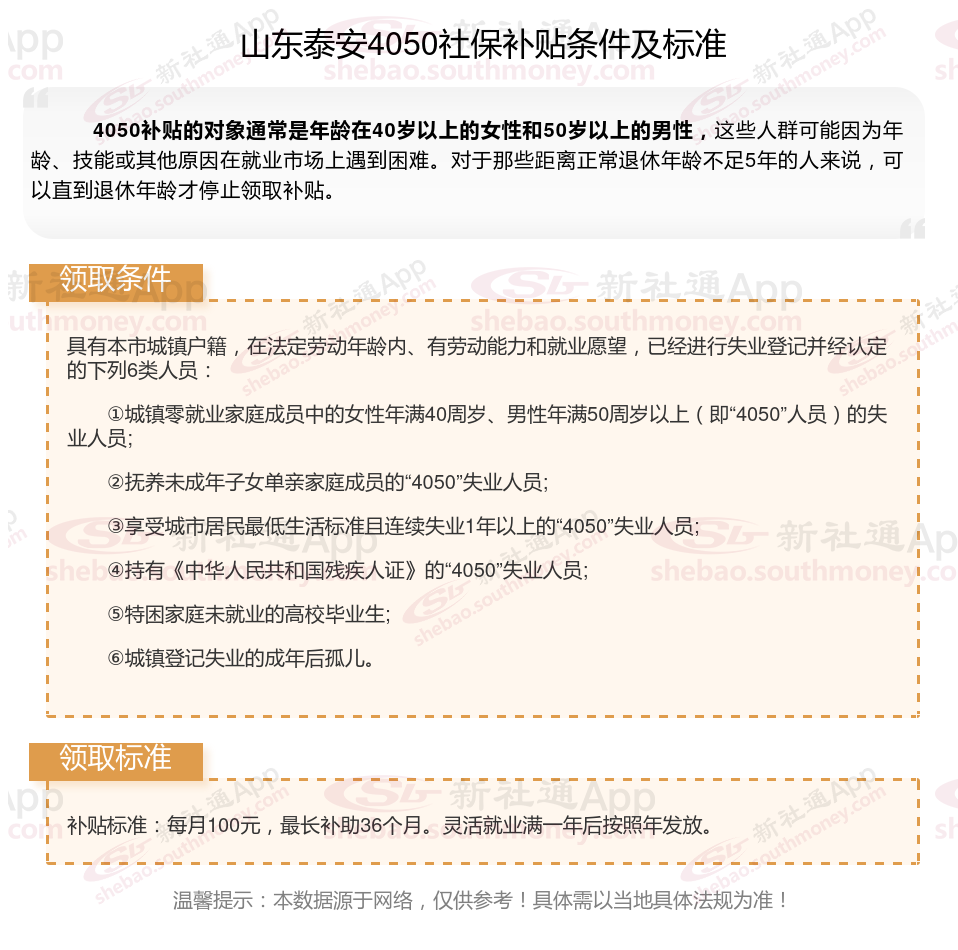 一、山东泰安4050社保补贴标准及条件2025年最新消息