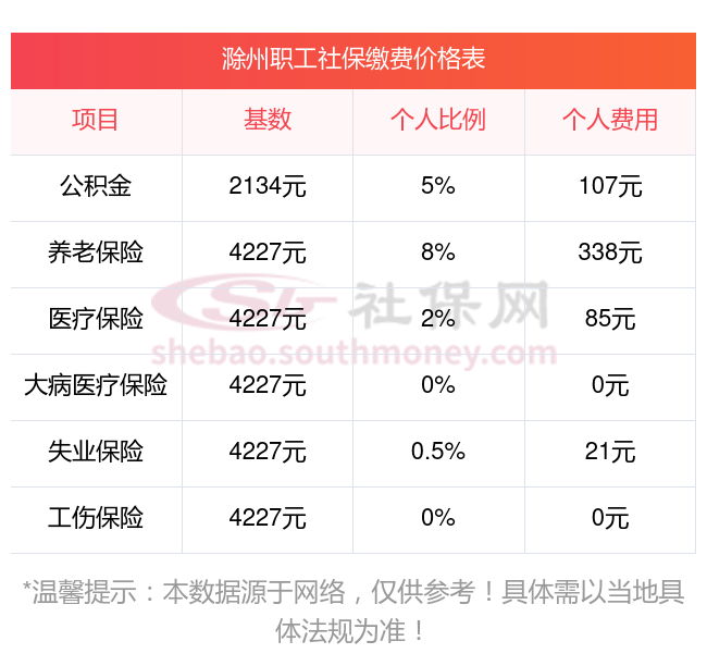 2025年滁州五险缴费标准是多少,2025年滁州社保缴费多少钱?下表是2025年滁州社保费用明细参考,新社通app-社保缴费查询工具提供的最新数据如下: