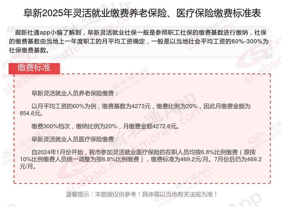 2025年阜新灵活就业缴费标准个人交多少呢, 个人是可以自己交社保的吗?根据新社通app-社保缴费查询工具提供的最新数据如下: