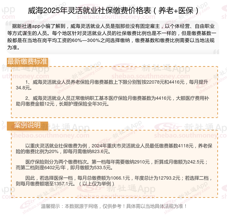 据新社通app数据显示,威海灵活就业养老保险缴费基数2024-2025年最新标准如下: