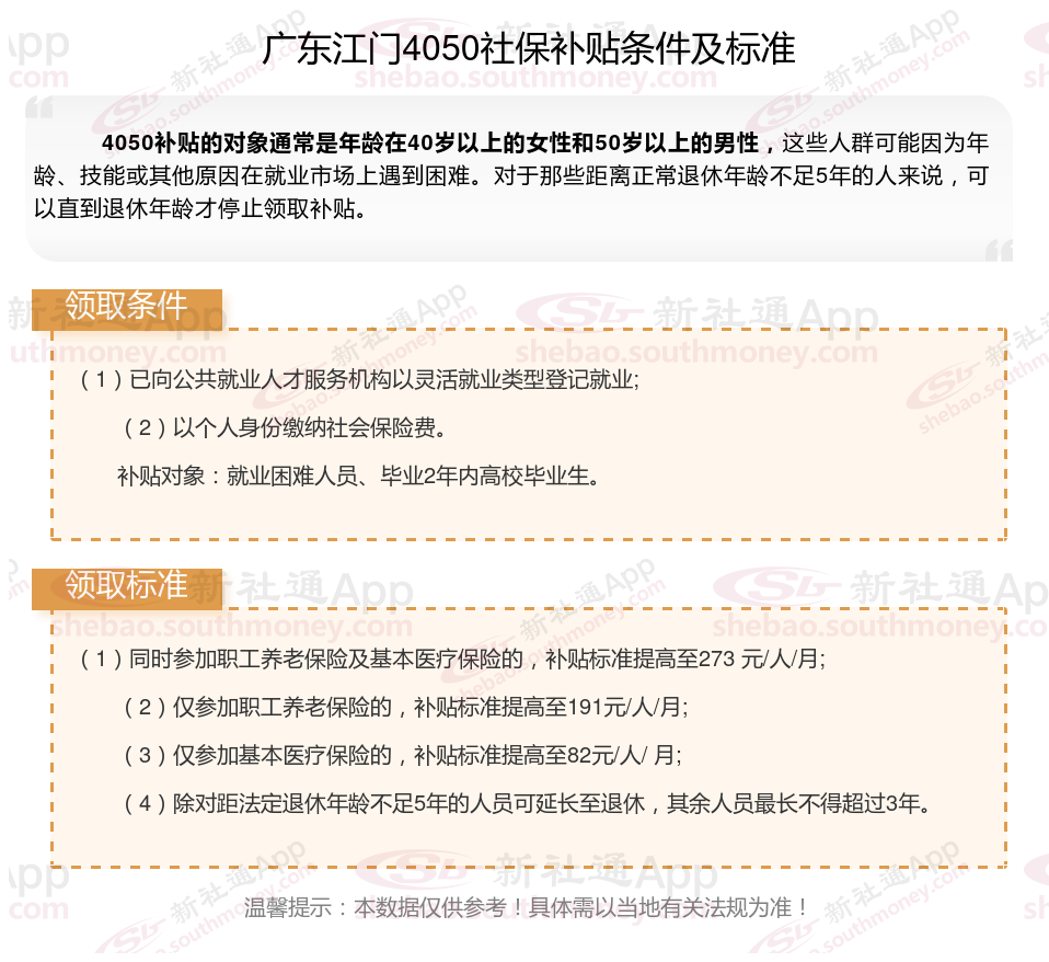 一、广东江门4050社保补贴标准及条件2025年最新消息