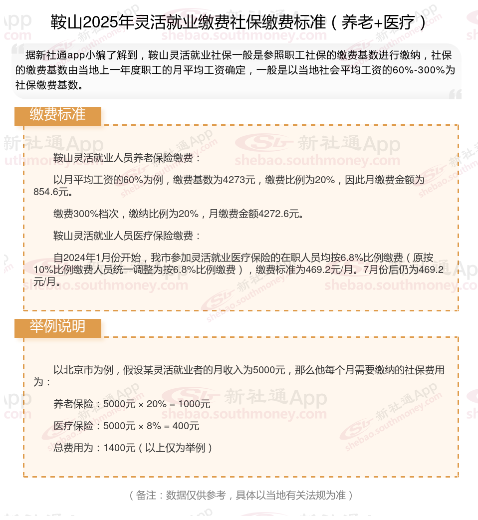 据新社通app数据显示,鞍山灵活就业养老保险缴费基数2024-2025年最新标准如下: