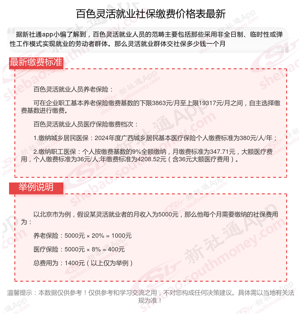 百色灵活就业人员的社保缴费标准是多少?根据新社通app-社保缴费查询工具提供的最新数据如下: