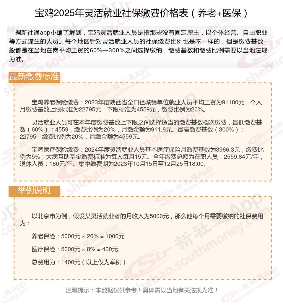 据新社通app数据显示,宝鸡灵活就业人员养老保险缴费基数2024-2025年最新标准如下: