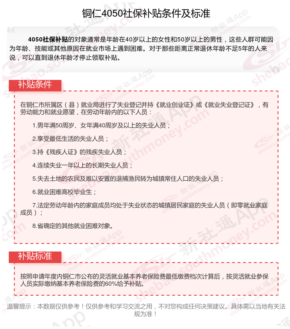 铜仁4050灵活就业社保补贴是什么?今天聊一下4050补贴话题。4050补贴听起来像是一个针对特定年龄人群的社保补贴。比如女性需年满40周岁,男性需年满50周岁(以申请当年12月31日为截止日期)。那么铜仁4050灵活就业社保补贴标准是多少钱?铜仁4050社保补贴可以领取多少?接下来随新社通APP小编了解一下铜仁4050灵活就业社保补贴的最新资讯。