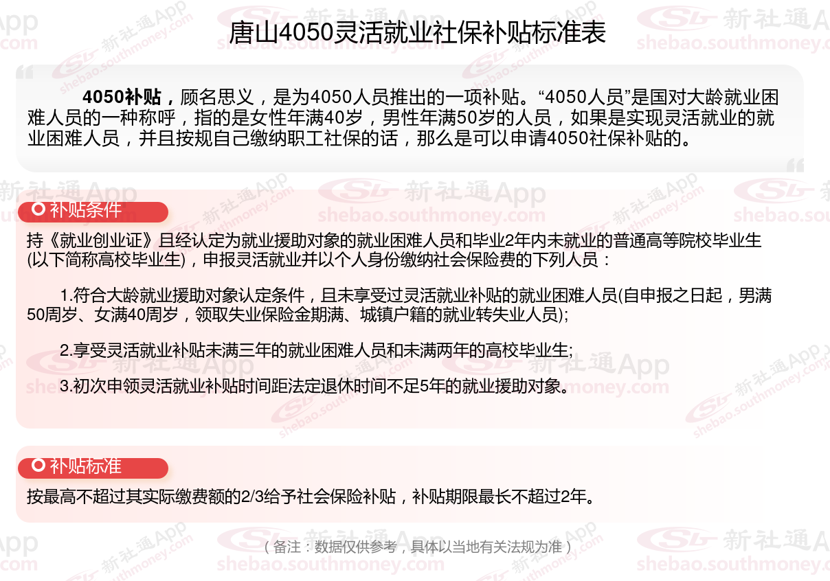 4050补贴主要是针对大龄就业困难人群的社保补贴,申请条件包括年龄、就业困难、灵活就业并自费缴纳社保,需要持有失业登记证,不同地区可能有细微差别,比如农村户口的限制。那么唐山4050灵活就业社保补贴标准是多少钱?唐山4050社保补贴条件是什么?接下来随新社通APP小编了解一下最新资讯。