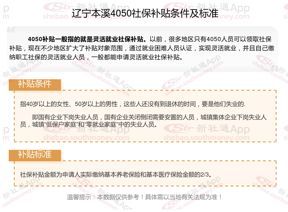 二、2025年辽宁本溪灵活就业4050社保补贴标准及条件是什么