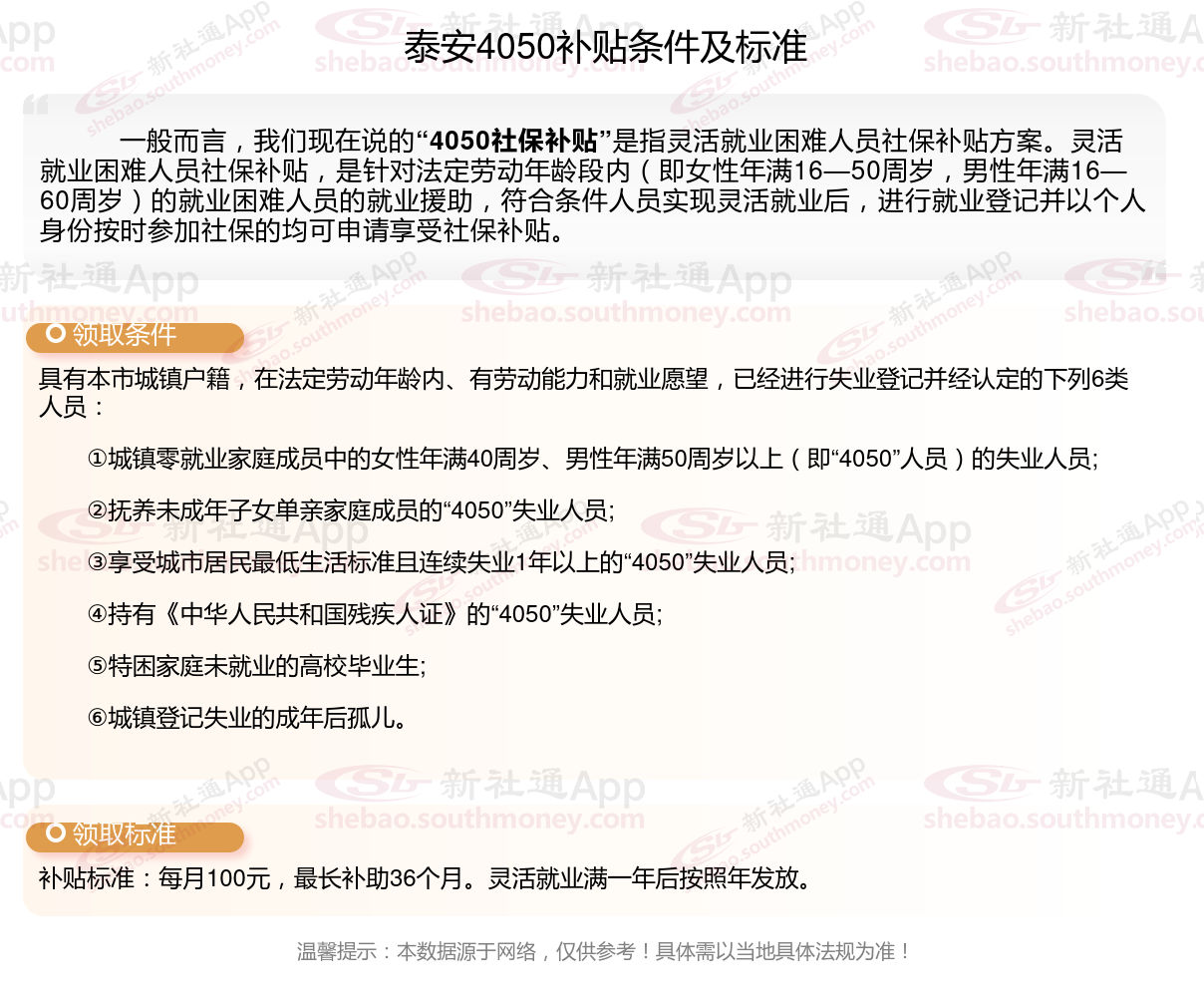4050补贴需要以灵活就业身份参加职工养老和医疗保险,补贴标准不超过实际缴费的三分之二,最长3年,距离退休不足5年的可延长到退休。补贴对象包括国企下岗人员、低保家庭等。申请流程需要提交身份证、银行账户等。那么泰安4050灵活就业社保补贴标准是多少钱?泰安4050社保补贴条件是什么?接下来随新社通APP小编了解一下最新资讯。