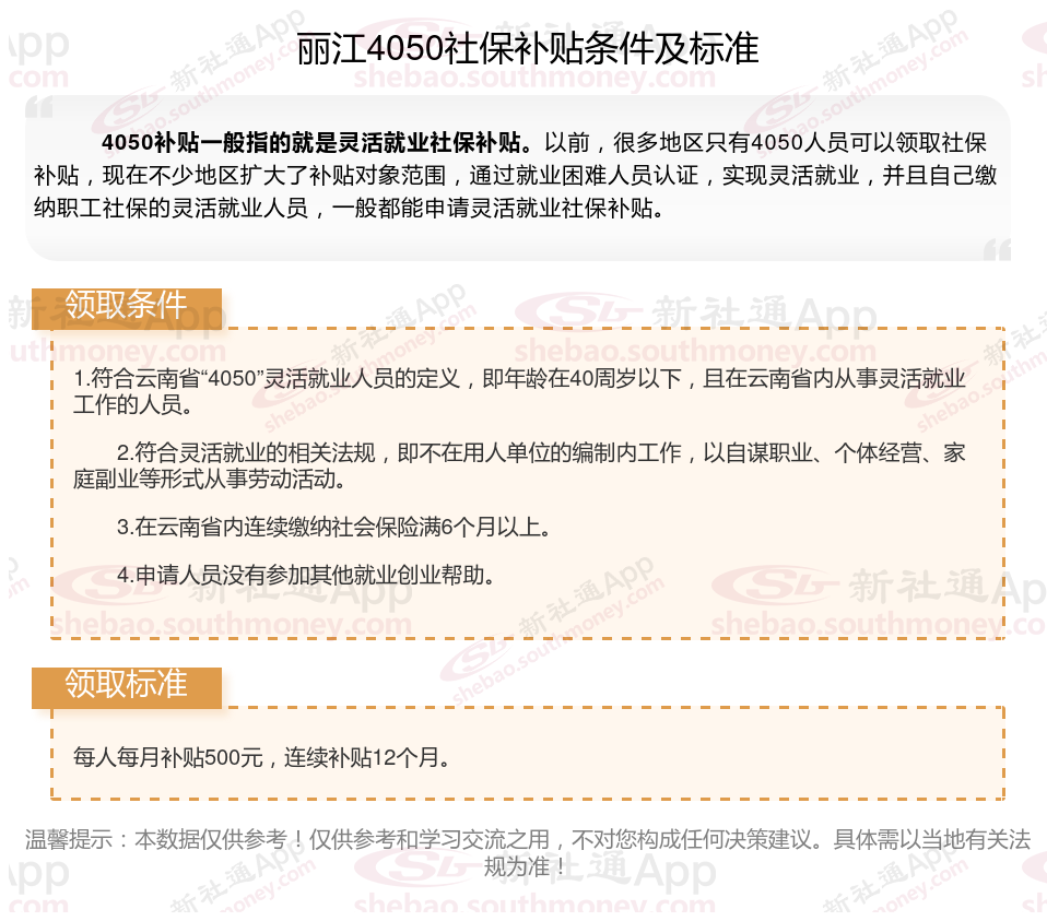“灵活就业4050社保补贴”需要以灵活就业身份参加职工养老和医疗保险,补贴标准不超过实际缴费的三分之二,最长3年,距离退休不足5年的可延长到退休。补贴对象包括国企下岗人员、低保家庭等。申请流程需要提交身份证、银行账户等。那么丽江4050灵活就业困难人员社保补贴标准是多少?丽江4050社保补贴需要符合什么条件?接下来随新社通APP小编具体了解一下4050社保补贴内容。