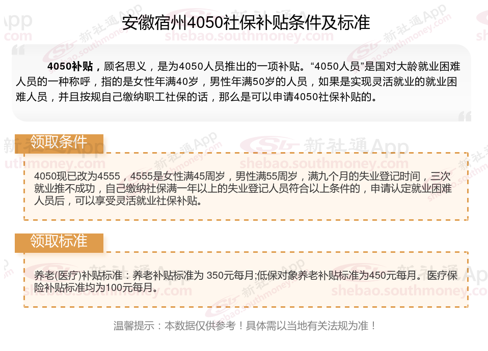 今天聊一下4050补贴话题。4050补贴听起来像是一个针对特定年龄人群的社保补贴。比如女性需年满40周岁,男性需年满50周岁(以申请当年12月31日为截止日期)。那么安徽宿州4050灵活就业社保补贴标准是多少钱?安徽宿州4050社保补贴条件是什么?接下来随新社通APP小编了解一下最新资讯。