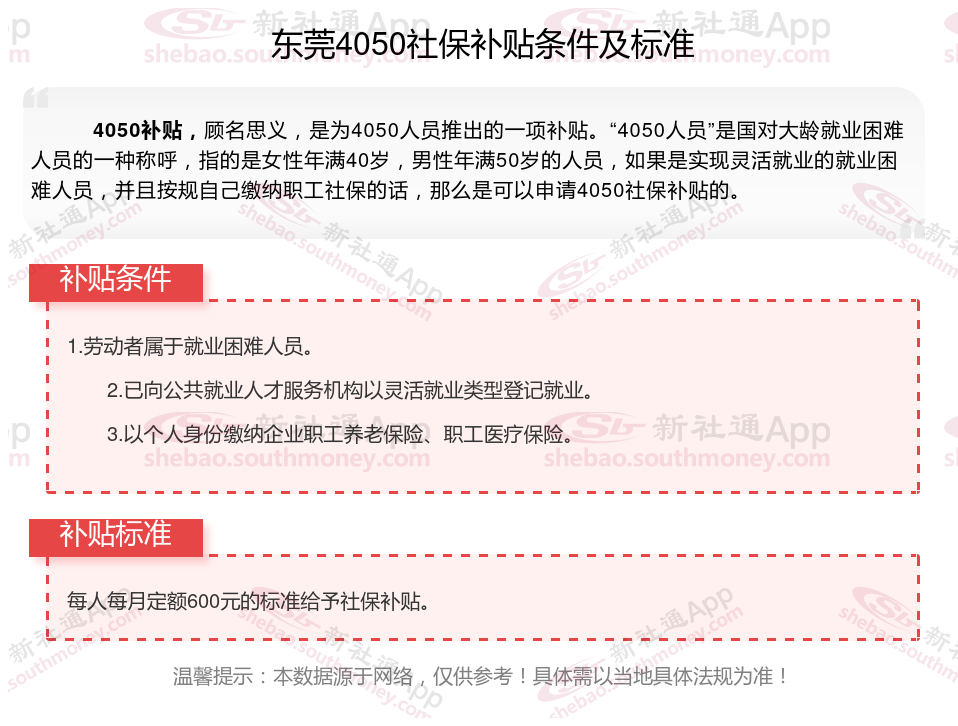 二、2025年东莞4050社保补贴标准及条件,最新如下: