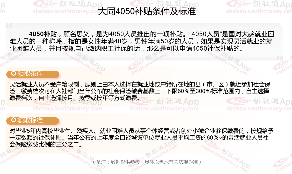 大同4050灵活就业社保补贴是什么?今天聊一下4050补贴话题。4050补贴听起来像是一个针对特定年龄人群的社保补贴。比如女性需年满40周岁,男性需年满50周岁(以申请当年12月31日为截止日期)。那么大同4050灵活就业社保补贴标准是多少钱?大同4050社保补贴可以领取多少?接下来随新社通APP小编了解一下大同4050灵活就业社保补贴的最新资讯。