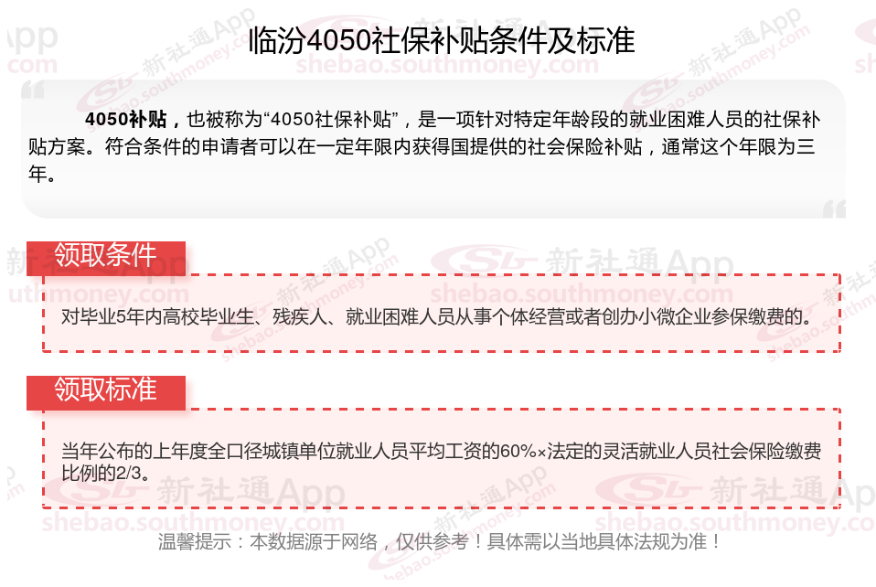 一、2025年临汾4050社保补贴新规2025年临汾4050社保补贴标准是什么,需要什么条件?