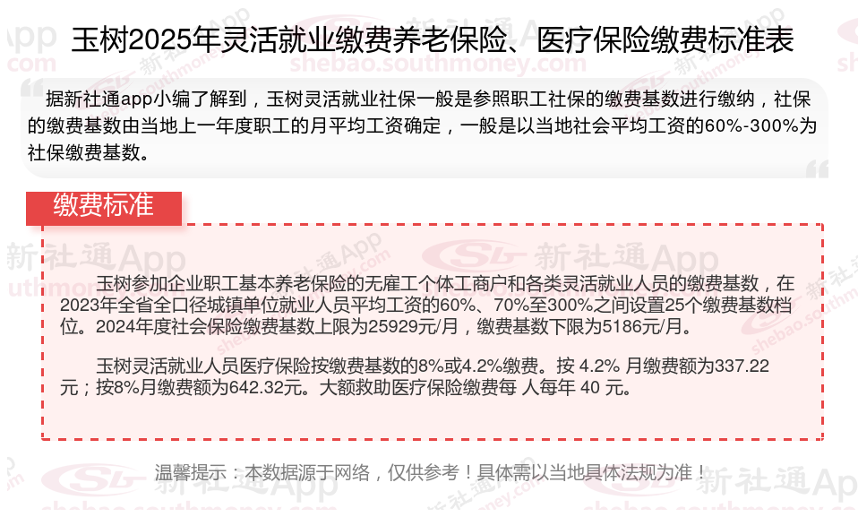 据新社通app数据显示,玉树灵活就业人员养老保险缴费基数2024-2025年最新标准如下: