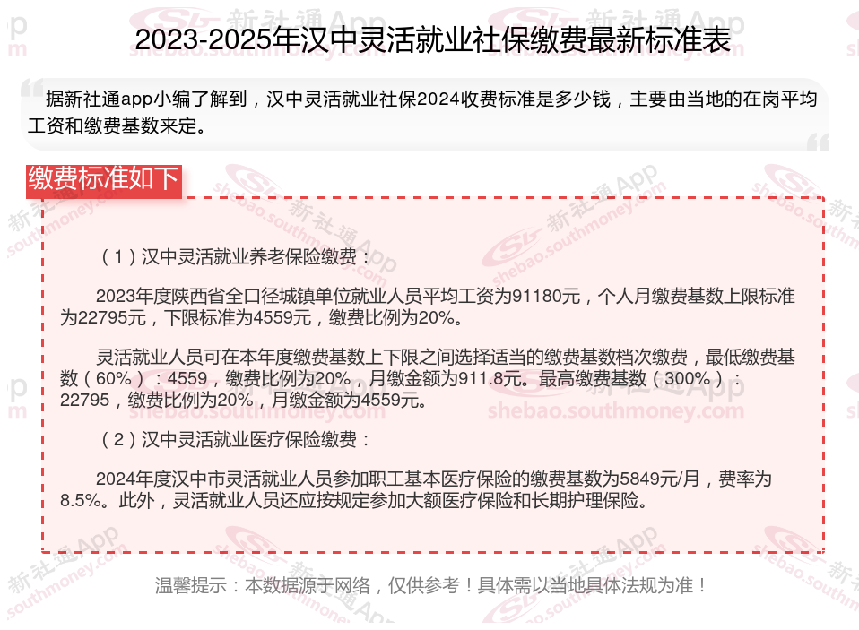 据新社通app数据显示,汉中灵活就业人员养老保险缴费基数2024-2025年最新标准如下: